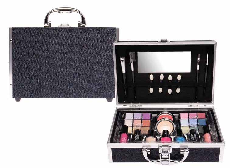 Černý třpytivý kovový kufřík pro dospívající slečny. Kufřík obsahuje oční stíny, tvářenky, laky na nehty, rtěnky, lesky na rty, aplikátory na make up a zrcátko. przeczytaj całość