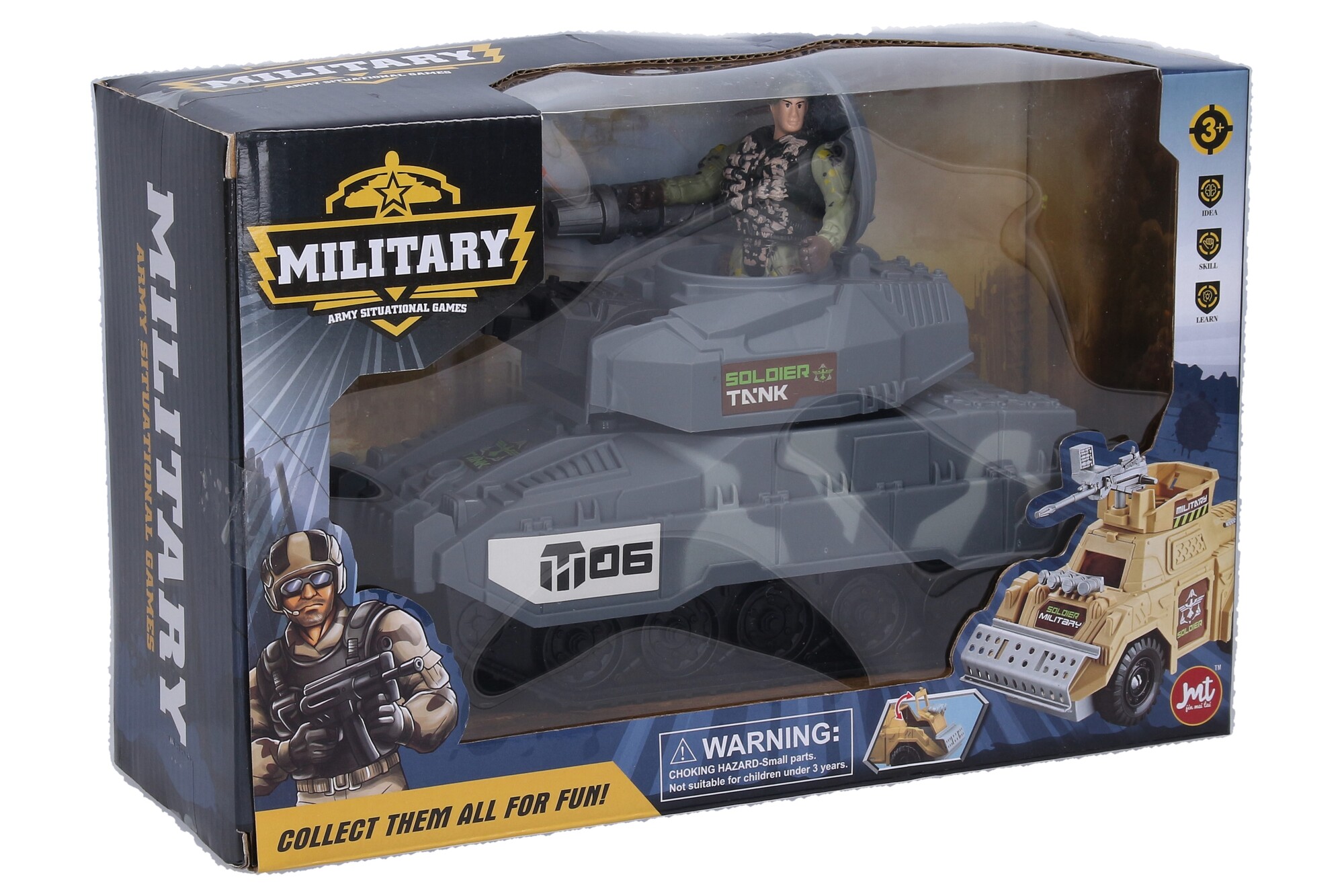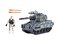 Tank střílející s figurkou. Velikost tanku 25 cm, vojáka 10 cm. Volná kola. 2 náboje do zbraně na tanku. Výstřel tlačítkem na zbrani. Obrázkový návod na používání na spodní a zadní straně obalu. przeczytaj całość