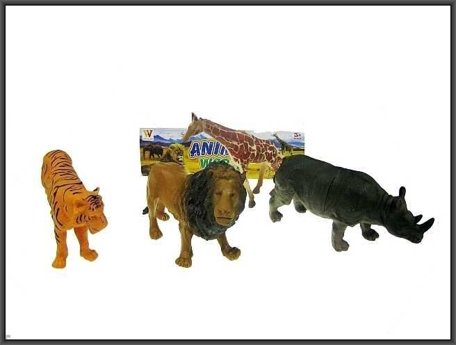 Zestaw zwierząt z sawanny. Wykonanych z plastiku.W zestawie: nosorożec, żyrafa, lew, tygrysZapakowane w przeźroczysty worek.Wymiar produktu:21-24cmWymiary opakowania: 43x27x7cmWiek: 3+ przeczytaj całość