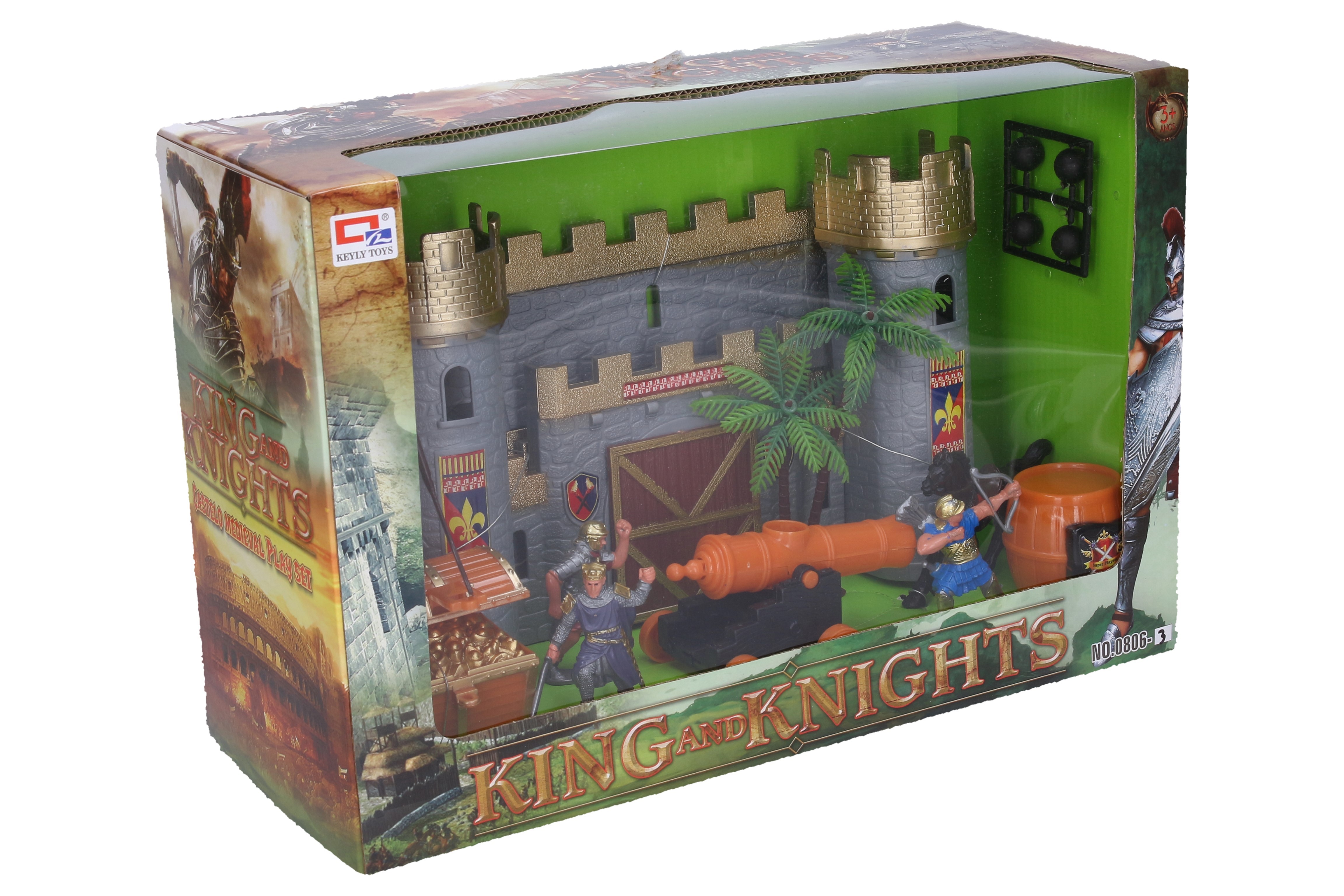 Hrad s figurkami. Balení obsahuje hrad, loďku, kanón, truhlici s pokladem, figurku koně, figurku krále, figury 2 vojáků. przeczytaj całość