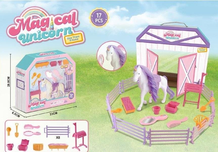 Flokowany jednorożec dla lalki. W zestawie znajdują się również elementy do pielęgnacji jak: grzebień do czesania pięknej grzywy konia oraz jego ogona, grabie, poidło, płot. W zestawie łącznie znajduje się 18 elementów. Produkt zapakowany w kartonowe opakowanie z przezroczystym okienkiem. Produkt dla dzieci powyżej 3 lat. Podane wymiary są wymiarami opakowania.