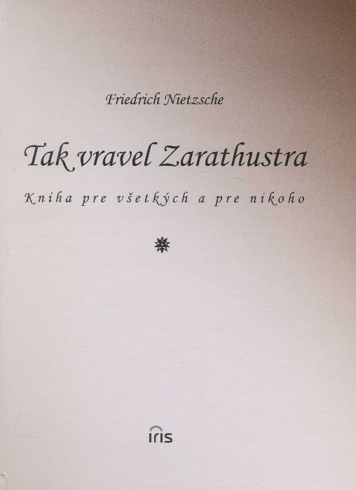 Nietzcheho dielo Tak vravel Zarathustra vychádza v slovenskom jazyku prvý raz. Obsahuje kritiky morálky založenej na kritike človeka ako indivídua s deformovanými vlastnosťami, ktoré z neho robia baránka namiesto dravého vtáka. Cieľom má byť nadčlovek, ktorého obraz je filozofický mýtus...