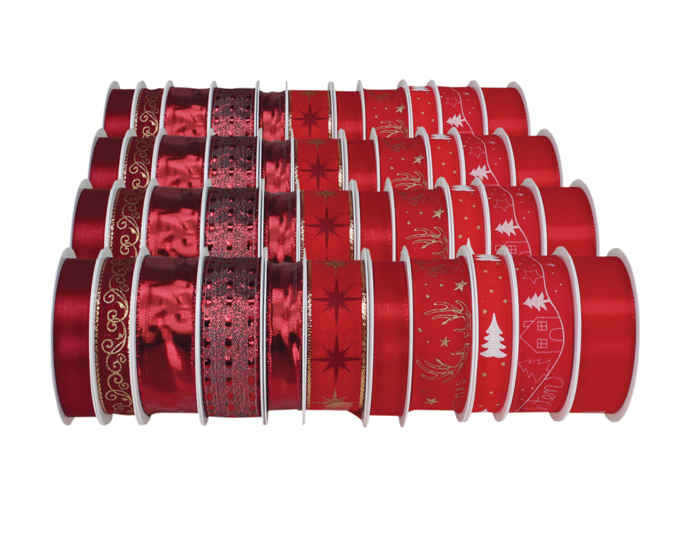 Sada dekoračních stuh na cívce. Stuhy jsou v různých šířkách a odstínech, které se vzájemně dají dobře kombinovat. Vhodné pro období Vánoc. Rozměry: 12x 3m/1,5cm, 24x 2,5m/2,5cm, 4x 2m/4cm. Barvy a motivy: tmavě červená, červená, zlaté zdobení, ornamenty, paroží, hvězdy, stromky. przeczytaj całość