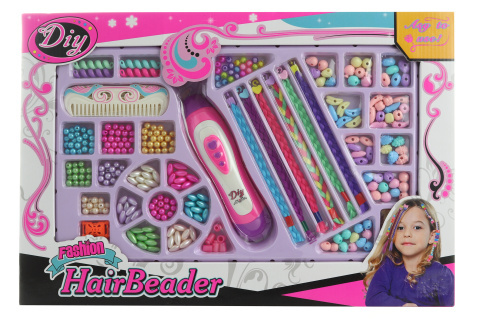 Duży zestaw dla małych fryzjerek. Opakowanie zawiera urządzenie do plecenia, 5 kolorowych warkoczyków, grzebień oraz mnóstwo koralików o różnych kształtach, kolorach i rozmiarach. Pakowane w pudełku. Wymiary opakowania ok. 50x34x6 cm. Wiek 3+. Zalecany nadzór osoby dorosłej. przeczytaj całość