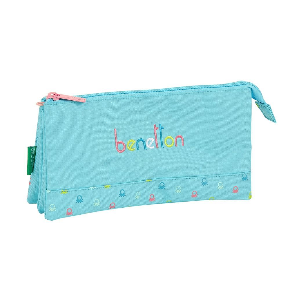 Třídílný modrý penál na tužky s barevnými detaily a znakem značky Benetton. Zapínání na zip.