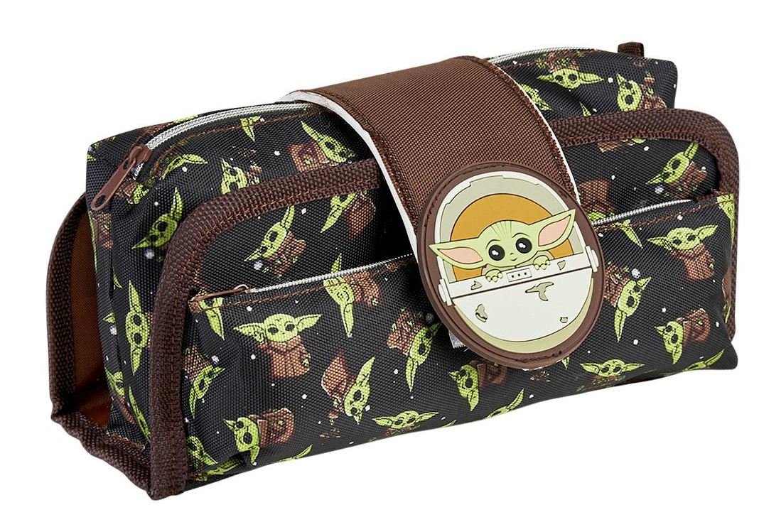 Školní hnědý penál na tužky s grafikou Mandalorian, uprostřed penálu je umístěna přezka. na které je vyobrazen motiv postavy Baby Yoda.