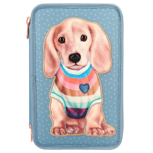 Penál 3 patra s výbavou Top Model, Světle modrý s jezevčíkem