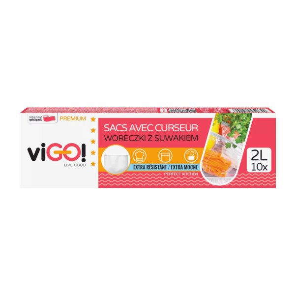 viGO! Woreczki zamykane ze suwakiem - 2 l - 10 szt. Idealne do przechowywania żywności w lodówce lub zamrażarce oraz do przechowywania rzeczy. Woreczki są bardzo wytrzymałe i można ich używać wielokrotnie; dzięki suwakowi bardzo wygodnie się otwierają i zamykają. Chronią przed wilgocią. Materiał nie wpływa na smak i zapach jedzenia. Opakowanie zawiera: 10 szt. o pojemności 2 l