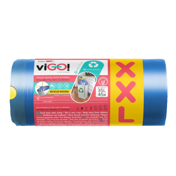 viGO! Pytle na odpad se zatahovací páskou - s vůní levandule - 35l - XXL balení 45 ksOdolné modré pytle se zatahující páskou na odpad o objemu 35 l. Role obsahuje 45 pytlů o rozměru 50x65 cm a tloušťce 22 micronů. Pytle mají příjemné aroma s vůní levandule která neutralizuje pachy.Ekologické a šetrné k životnímu prostředí.Uchovávejte mimo dosah dětí.