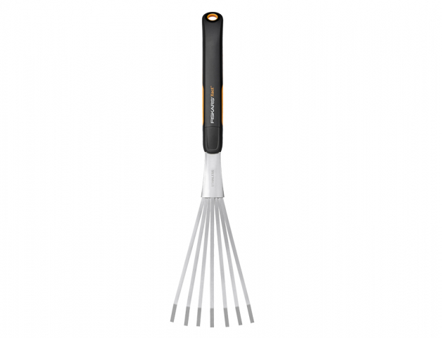 Ręczne grabie dzięki wachlarzowatemu kształtowi zębów są idealne do grabienia w małych rabatkach i trudno dostępnych miejscach. Część robocza wykonana jest z odpornej stali nierdzewnej. Ergonomiczny uchwyt z hartowanego aluminium ma komfortową powłokę Softgrip. Dłuższy uchwyt zapewnia perfekcyjną równowagę narzędzia, posiada otwór do łatwego zawieszania i przechowywania. Szerokość: 125 mm, 443 mm, 40 mm, waga: 200 g.
