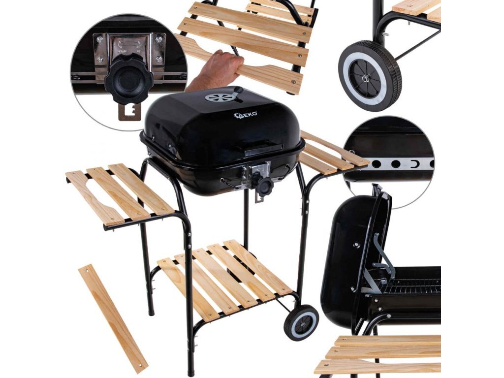 Gril na dřevěné uhlí, s nastavitelným roštem 40x40cm, víkem a dřevěnými policemi GEKOGril na dřevěné uhlí, s nastavitelným roštem 40 x 40 cm, s víkem a dřevěnými odkládacími policemi, perfektní volba pro všechny nadšence venkovního grilování. Tento gril je ideální spojenec pro nezapomenutelné...