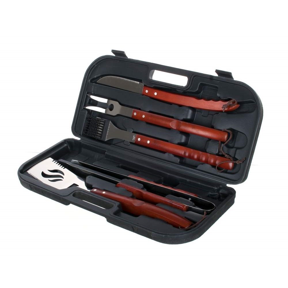 Zestaw ze stali nierdzewnej z drewnianą rączką w plastikowym kuferku zawiera: szczotkę drucianą do czyszczenia 48 cm, ząbkowane szczypce do grillowania 45 cm, szpatułę 48 cm, nóż do porcjowania z ostrzem o długości 45 cm, widelec z 2 grotami 46 cm. przeczytaj całość