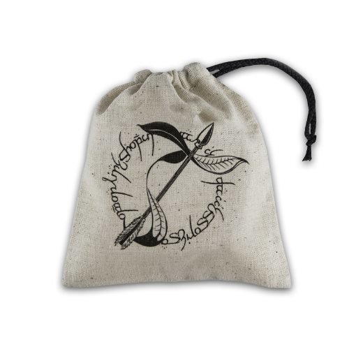 Béžový plátěný stahovací váček na kostky zdobený elfím písmem a motivy. przeczytaj całość