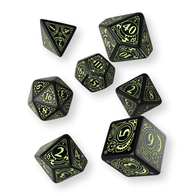 Sada precizně vyvedených kostek, jež jsou zdobeny steampunkovými motivy - ozubenými kolečky, částmi strojů, šroubky a potrubími. Ideální doplněk pro hráče her na hrdiny a milovníky steampunkového žánru. Sada obsahuje sedm kostek: čtyř, šesti, osmi, desíti, dvanácti, dvaceti stěnnou a procentovou kostku. Černé kostky s čísly a ornamenty vyvedenými fluorescenční barvou - ve tmě svítí!