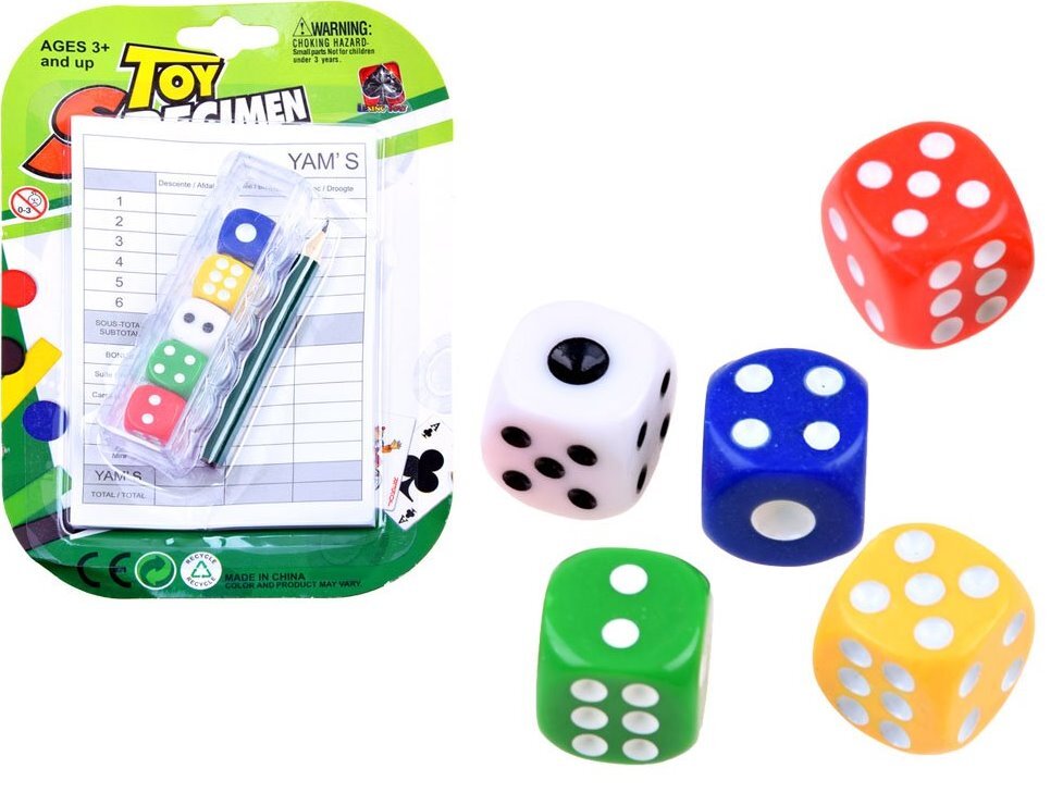Barevné hrací kostky (5ks) s příslušenstvím pro zapisování