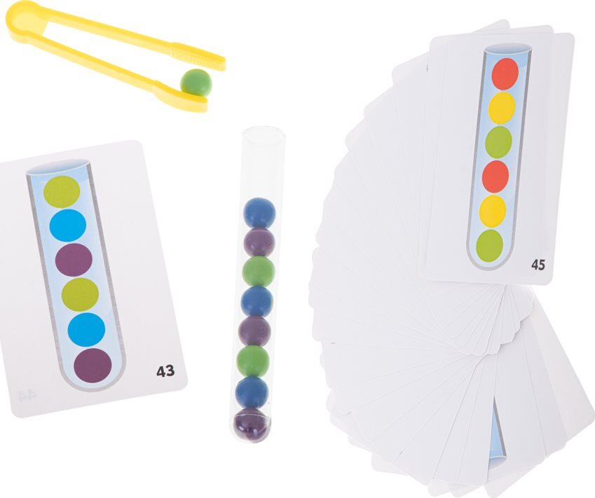 Praktyczny zestaw zawiera 40 kulek, 1 pęsetę, 1 probówkę i 24 dwustronne karty (łącznie 48 motywów), które zapewnią wystarczającą różnorodność i wyzwania. Dzięki poręcznemu designowi i prostym zasadom dzieci mogą cieszyć się zabawą w domu i w podróży.