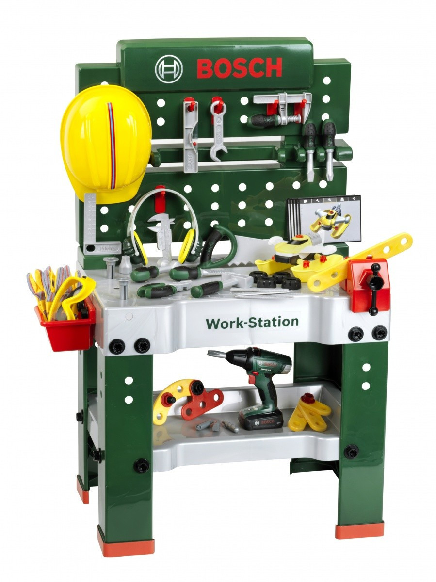 Warsztat Bosch duży 81 elementów W pełni wyposażony stół warsztatowy dla dzieci jest produkowany w Niemczech na licencji Bosch. Blat oferuje liczne funkcje edukacyjne, imadło oraz praktyczne miejsca do przechowywania i schowek. Na tylnej ścianie ławki do majsterkowania oraz na półce pod blatem...