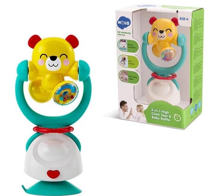 Zabawka z grzechotkami w kształcie misia, którą można zamontować na stoliku dziecka, na jego krześle, na parkiecie i innych płaskich powierzchniach.