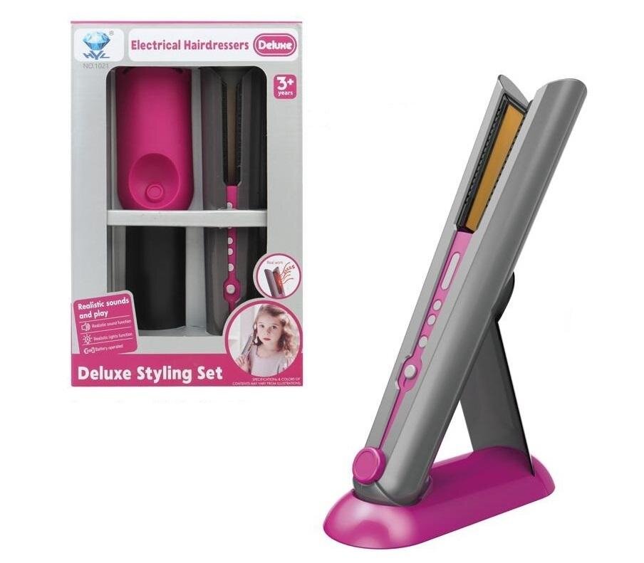 Prostownica ze światłem i dźwiękiemW zestawie:prostownicapodstawkaFunkcje:podświetlane płytki "grzejące"realistyczne dźwiękibaterie: 2 x AA 1,5V brak w zestawie przeczytaj całość