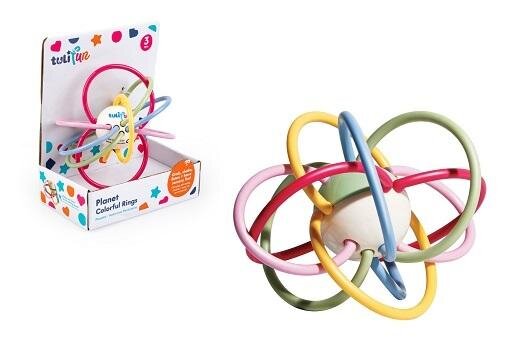 Piłeczka ozdobiona pierścieniami zachęca do nauki chwytania! Miękkie linki, które okalają zabawkę, ułatwiają dziecku trzymanie jej w rączkach. Obręcze są różnokolorowe, co umila korzystanie z zabawki i pomaga najmłodszym w rozwijaniu zdolności poznawczych.