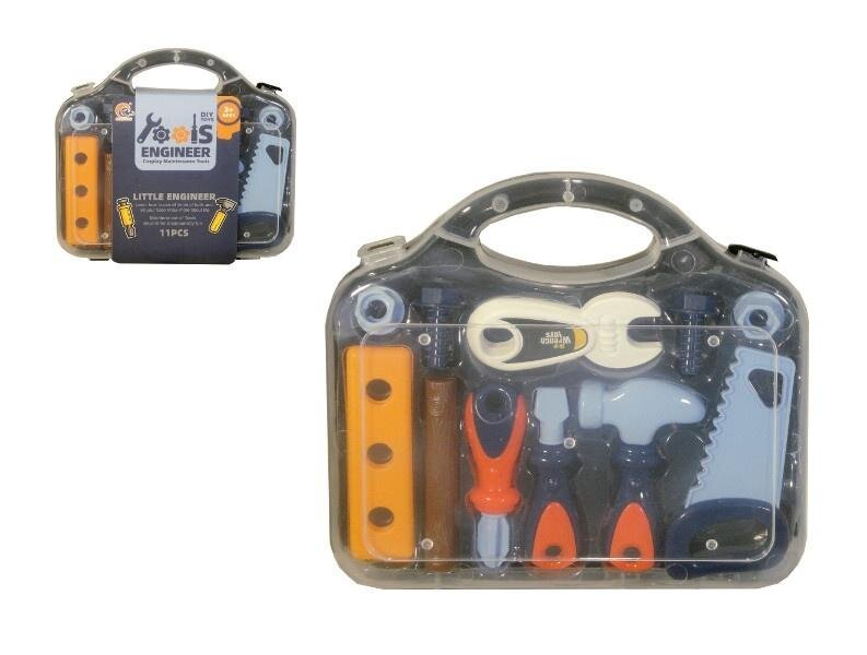 Zestaw narzędzi da małego majsterkowicza zamknięty w plastikowej walizce. W skład zestawu wchodzą młotek, piła, śrubokręt, śruby, klucz. Produkt przeznaczony dla dzieci od 3 lat. Podane wymiary stanowią wymiar opakowania. przeczytaj całość