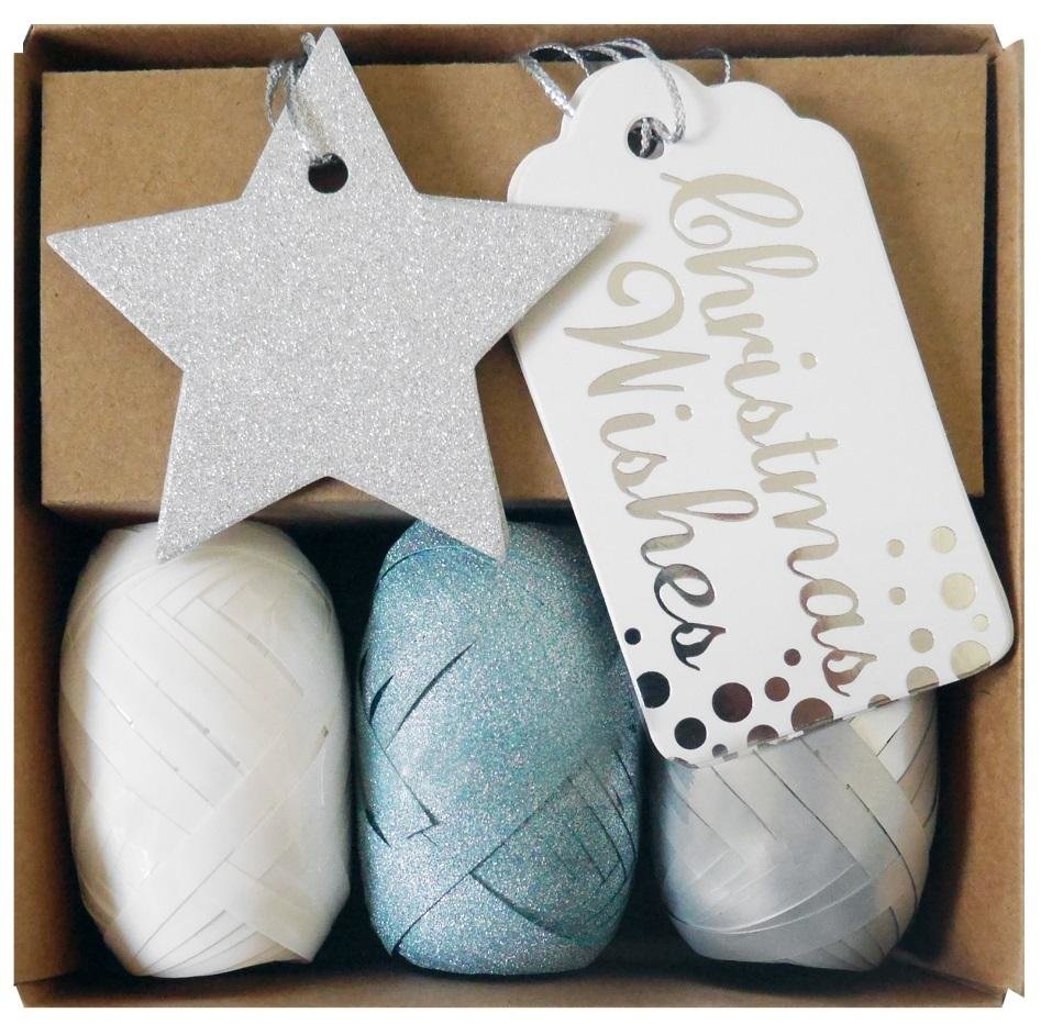 ZESTAW DO PAKOWANIA BIAŁO, SREBRNO NIEBIESKI 3X WSTĄŻKA 10M, 6 TAGÓW przeczytaj całość