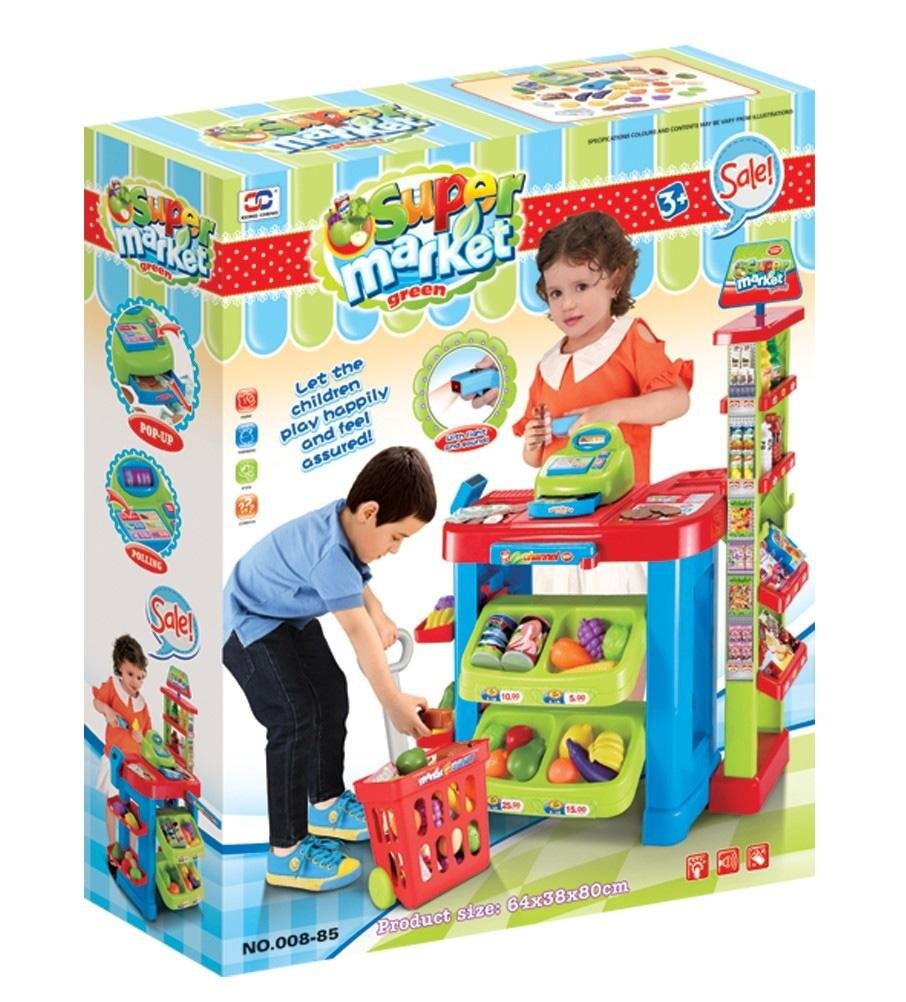 Zestaw zawira kasę ze skanerem, koszyk na zakupy . W zestawie znajdują się plastikowe warzywa, owoce i inne akcesoria niezbęne w sklepie spożywczym. Wymiar supermarketu: 60,5x38x80cm przeczytaj całość