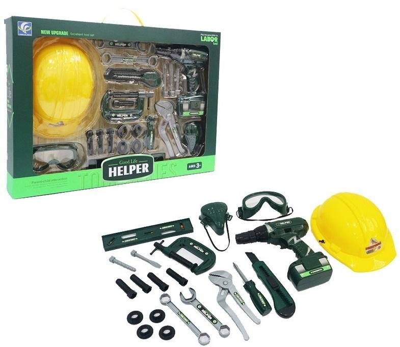 Zestaw narzędzi - 23 elementywkrętarka, kask, gogle, maska, śrubokręt, klucze, poziomnica, nożyk, śruby, nakrętkiwymiary opakowania: 52.5 x 7 x 36.5 cm, wiek 3+ przeczytaj całość