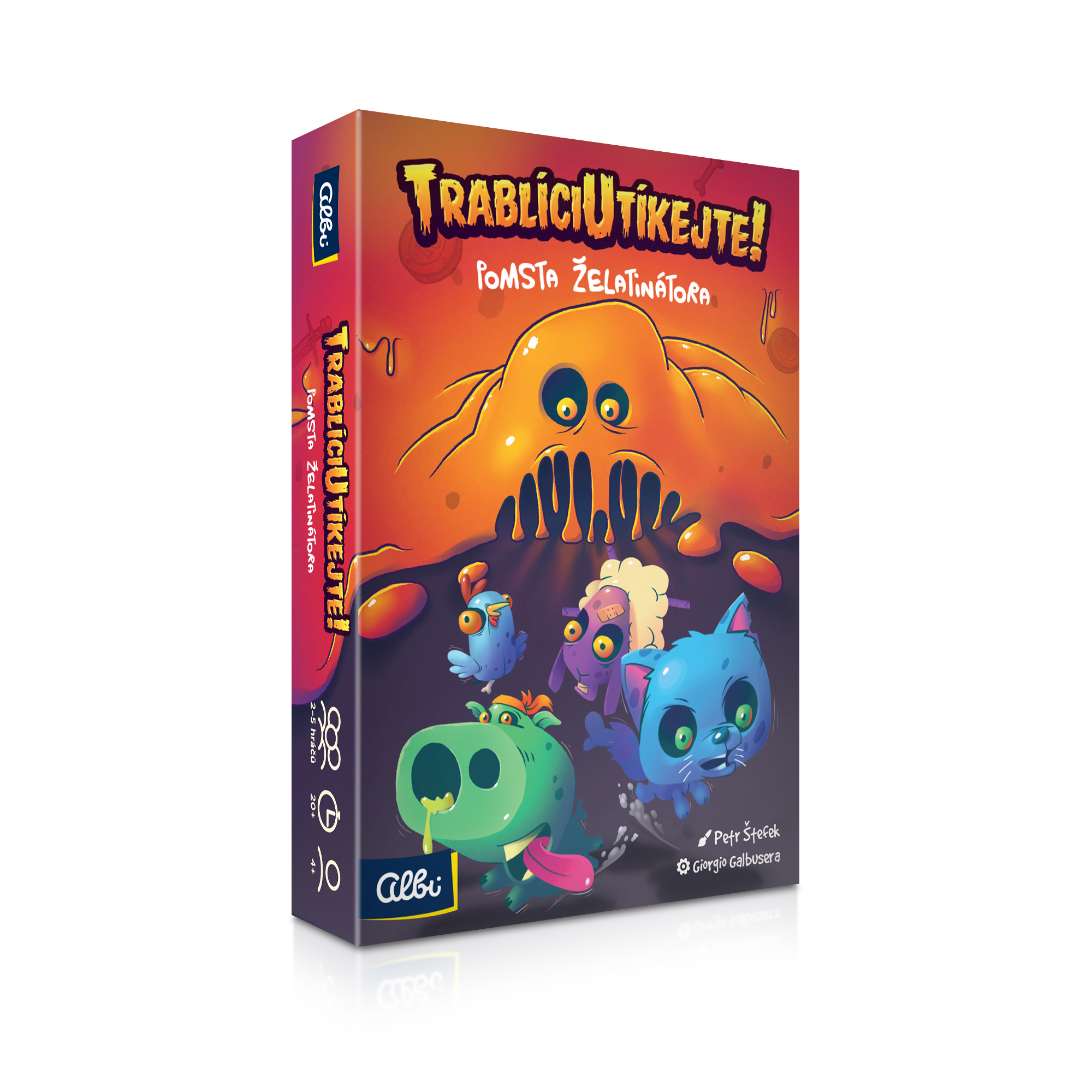 Trablíci utíkejte! Pomsta Želatinátora je svižná dětská hra na 20 minut, ve které budete sbírat sety zombie zvířátek. Hra Trablíci utíkejte!: Pomsta Želatinátora obsahuje: 6 kostek, 60 destiček zvířat, 10 destiček záchranných kruhů, 10 destiček medailí, 4 destičky želatiny, 4 postavičky hráčů, postavička želatinátora, žeton prvního hráče, česká a slovenská pravidla.