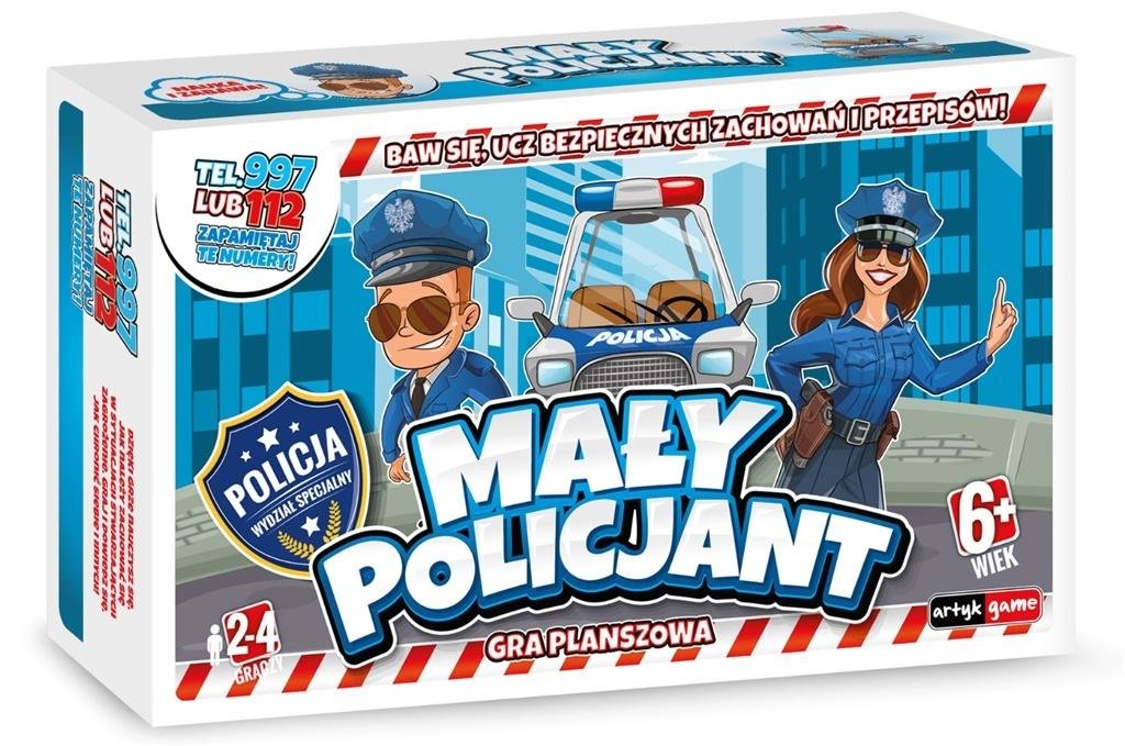 EDUKACYJNA GRA PLANSZOWA, DLA 2 - 4 GRACZY, GRA POKAZUJE DZIECKU NA CZYM POLEGA PRACA POLICJANTA, DZIEKO NAUCZY SIĘ NP: JAK POWINIEN PRZYGOTOWAĆ SIĘ DO JAZDY NA ROWERZE, JAK ZACHOWAĆ SIĘ, KIEDY DO DRZWI PUKA KTOŚ OBCY, DLACZEGO POWINIEN NOSIĆ ODBLASKI, KOGO I W JAKI SPOSÓB POWIADOMIĆ GDY DZIEJE...