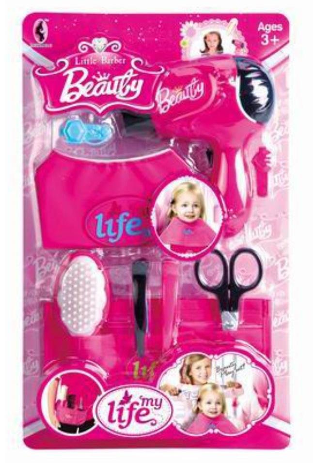 Zestaw fryzjerskich akcesoriów: suszarka, szczotka, nozyczki, spinki, pas na narzędzia.Suszarka zasilana 1 baterią AA, nie dołączona do zestawu. przeczytaj całość
