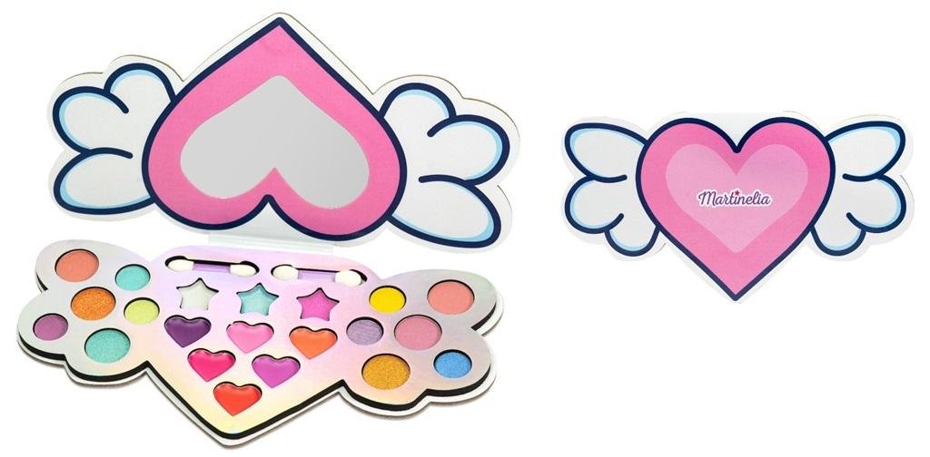 Paleta do dziecięcego makijażu w kształcie serca ze skrzydłami. Zestaw zawiera dwanaście cieni do powiek z brokatem i bez, sześć błyszczyków do ust, trzy kremy z brokatem i dwa aplikatory. Z lustrem w zestawie. przeczytaj całość