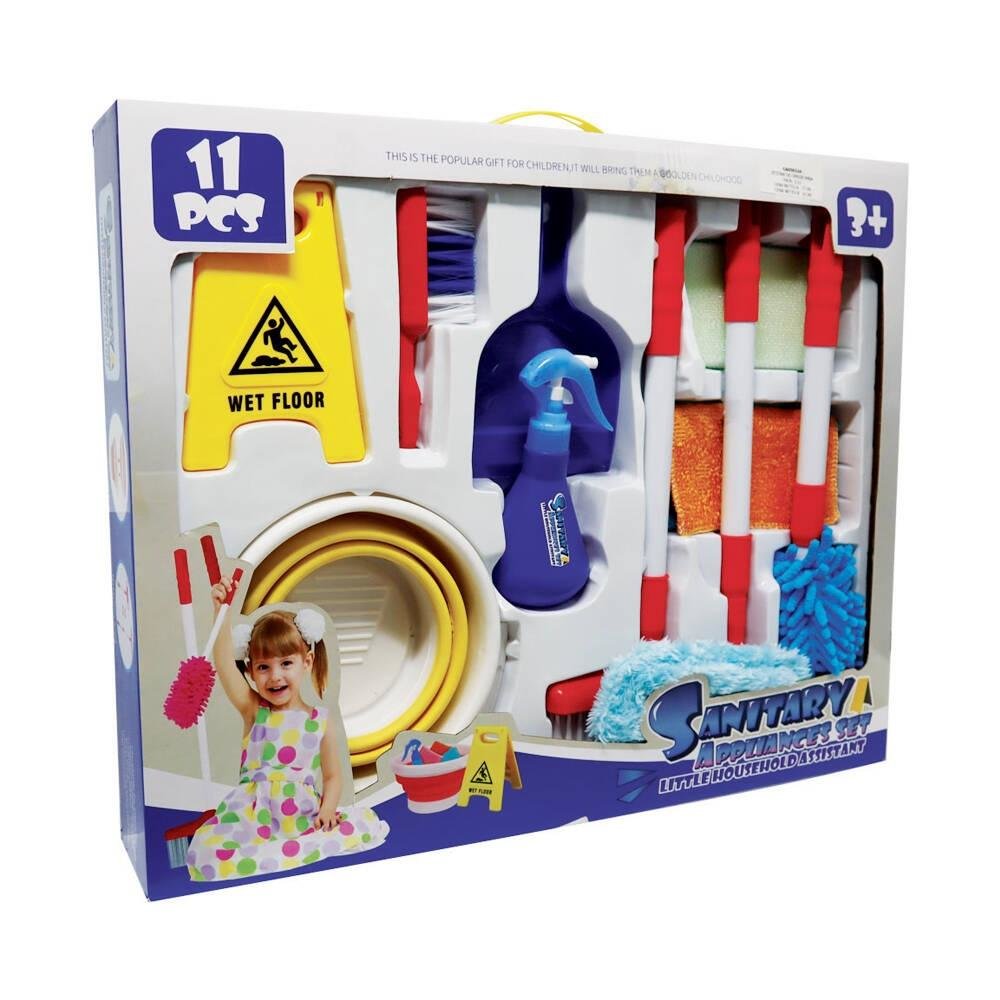 Zestaw do sprzątania, który zawiera: ścierkę, butelkę na płyn, mopa, szczotkę do kurzu, zmiotka, 2 szczotki do zamiatania, wiadro, znak ostrzegawczy. Produkt nie potrzebuje baterii. Zabawka przeznaczona dla dzieci powyżej 3 roku życia. przeczytaj całość