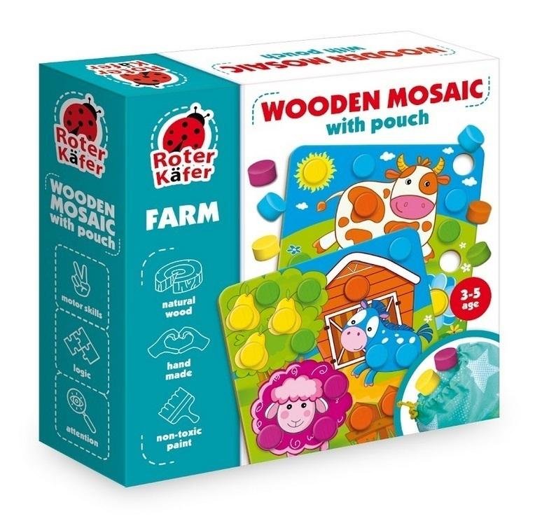 Krówka, zajączek, kurka i owca... Kto jeszcze? Uzupełniajcie kartki elementami mozaiki i poznawajcie mieszkańców farmy. Drewniana mozaika w woreczku pomoże poznać kolory, potrenować drobną motorykę i rozwinąć spryt i wyobraźnię. Liczcie ilość elementów i rozwijajcie logiczne myślenie. Albo...