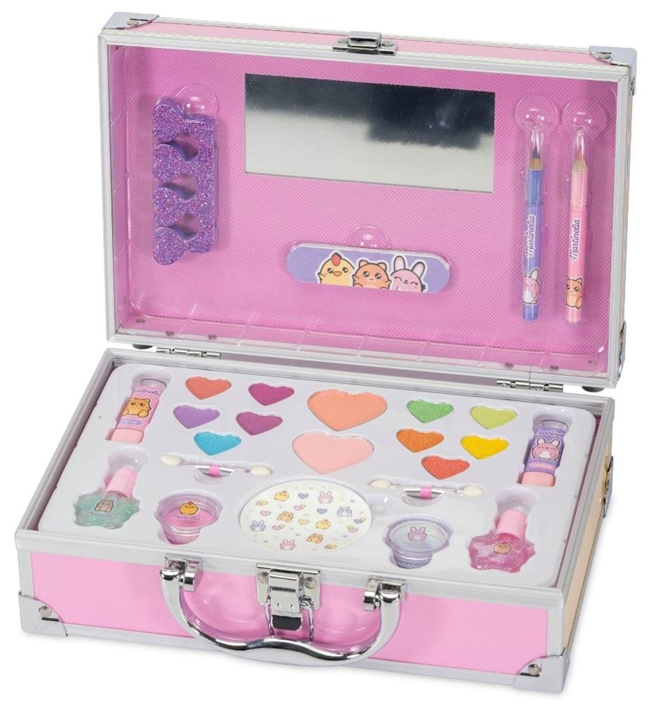 Walizka z kosmetykami dla dzieci. Zawartość: 10 cieni do powiek, 2 szminki, 2 lakiery do paznokci, pilnik do paznokci, separator, 2 aplikatory, lustro przeczytaj całość