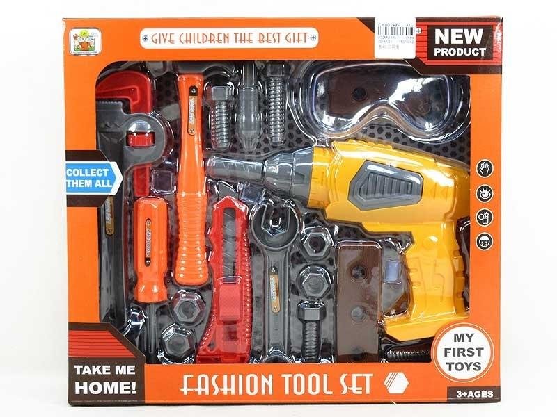 Zestaw narzędziowy, który zawiera: wiertarkę na baterie, okulary, śruby, nożyk, śrubokręt, młotek, klucz. Produkt nie potrzebuje baterii. Zabawka przeznaczona dla dzieci powyżej 3 roku życia, przeczytaj całość