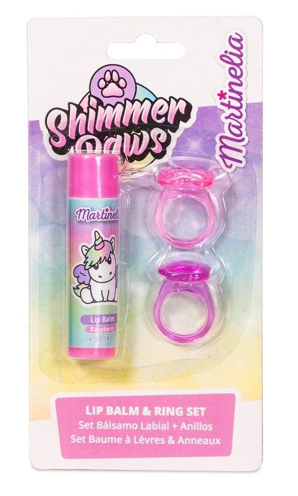 Zestaw balsam do ust i pierścionki. Zestaw zawiera jeden balsam do ust o smaku malinowym i dwa plastikowe pierścienie z brokatem w kształcie serca i kwiatu. przeczytaj całość