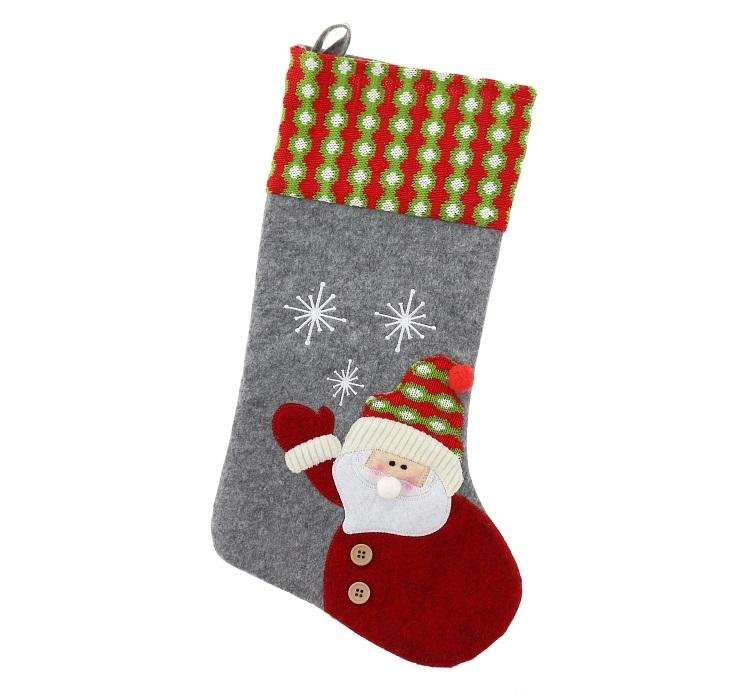 Skarpeta świąteczna na prezenty MIKOŁAJ filc Wymiary: 51 cm x 21.3 cm. Wykonana z materiału imitującego filc. Dekoracja w kolorze szarym. Zdobiona Świętym Mikołajem oraz białymi śnieżkami. Idealna jako dodatek do prezentu bądź dekoracja świąteczna. Dodatkowo posiada praktyczną pętelkę do... przeczytaj całość