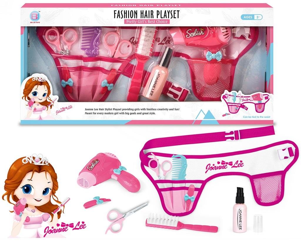 Pas fryzjerski z wszystkimi niezbędnymi akcesoriami: nożyczki, suszarka, szczotka, spinka, spray. przeczytaj całość