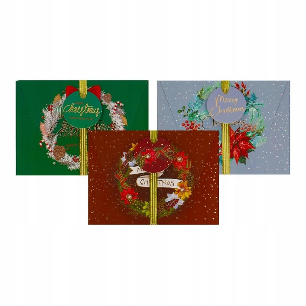 Pudełka na karty podarunkowe, gotówkę 3 sztuki:pudełeczka sztywne, wykonane z kartonu,elegancki wzór świąteczny wykończony metalicznym nadrukiem,świetny sposób na ofiarowanie gotówki, karty podarunkowej lub wszelkiego rodzaju voucherów,3 sztuki w zestawie,wymiar pudełka: 11 x 8 x 1 cm. przeczytaj całość