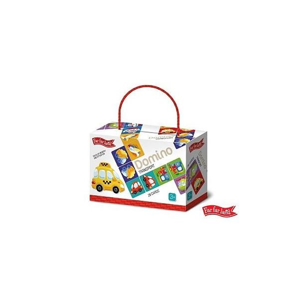 Far Far Land Domino s obrázky doprava. Balení obsahuje 28 karet. Hra pro 2-5 hráčů. Při hře 2 hráčů každý hráč dostane 7 karet. Při hře více hráčů každý dostane 5 karet. Zbývající karty jsou v banku.“ Hráč, který má "dvojitou" kartu (kartu s totožnými obrázky), hraje první. Pokud žádný z hráčů...