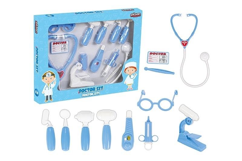 Zestaw lekarski niebieski.W zestawie:stetoskop,pęseta,strzykawka,młoteczek,termometr,mikroskop,okulary,akcesoria lekarskie,plakietka lekarza. przeczytaj całość