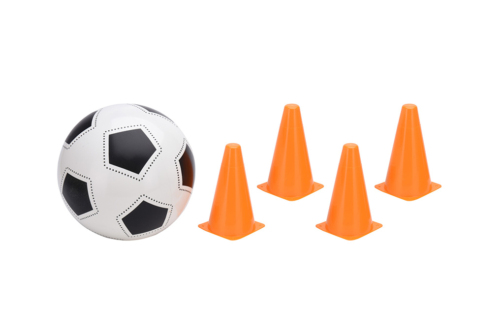 Čtyři kužely s gumovým míčem Technický popis: velikost míče: 5 výška kuželu: 17,5 cm obsahuje 1x míč + 4x kužel przeczytaj całość