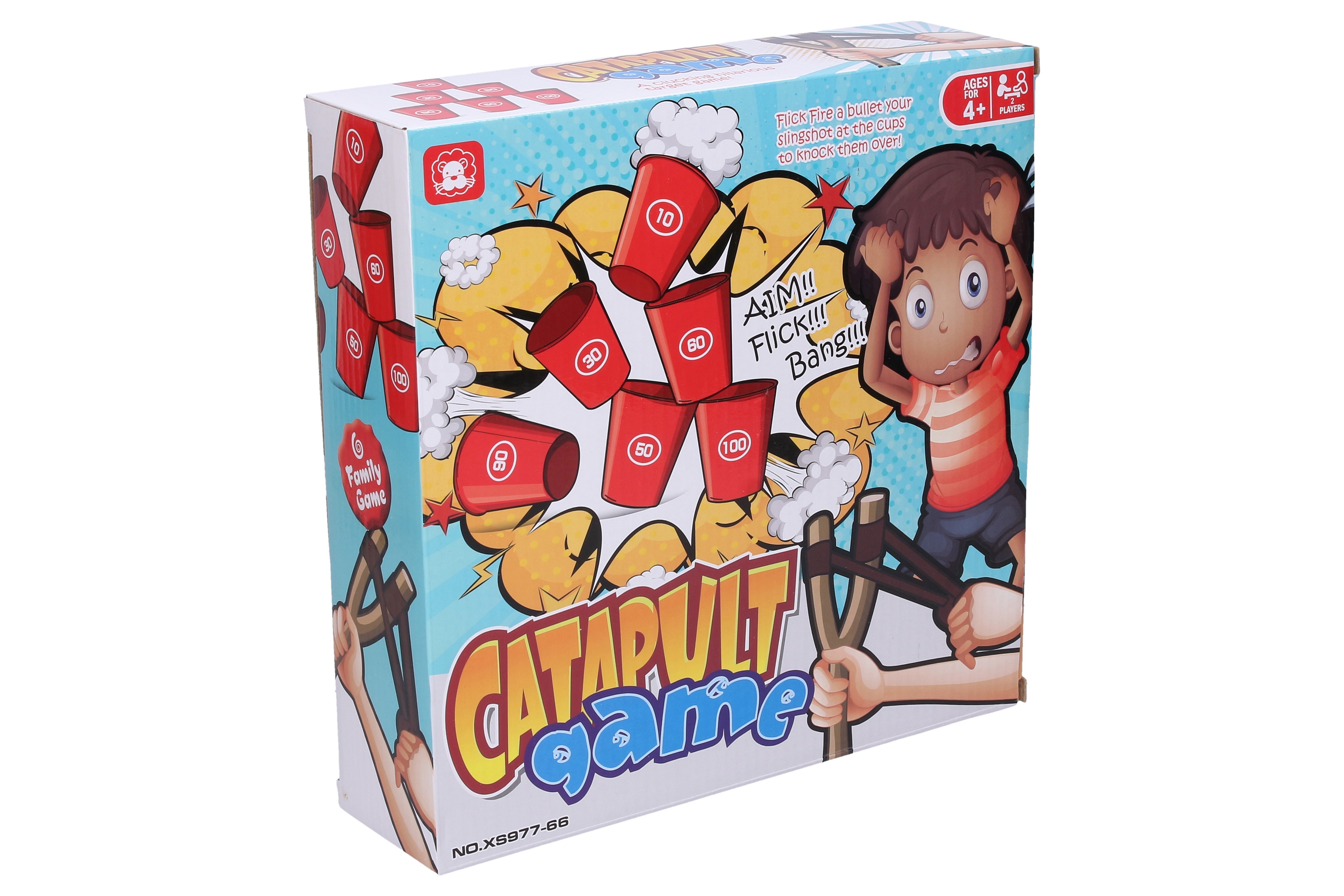 Hra prak s kelímky. Hra pro 1-2 hráče. Balení obsahuje 2 praky, 10 kelímků, 2 listy samolepek na kelímky, 6 míčků, návod, ruleta. Samolepky se skóre nalepte na kelímky a poskládejte je do tvaru pyramidy podle obalu. Roztočením rulety se určí pořadí hráčů. Hráči si počítají skóre podle sestřelených kelímků. Po sestřelení všech kelímků vyhrává hráč s více body.
