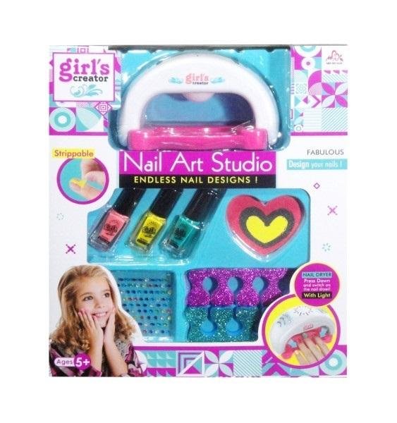 Zestaw do paznokci z suszarką, 3 kolorami lakierów, pilniczkiem, separatorami oraz ozdobami. Włącz suszarkę i ciesz się nowym manicurem. Lampka ze światłem. Produkt zapakowany w kartonowe opakowanie z przezroczystym okienkiem. Zabawka działa na baterie. przeczytaj całość