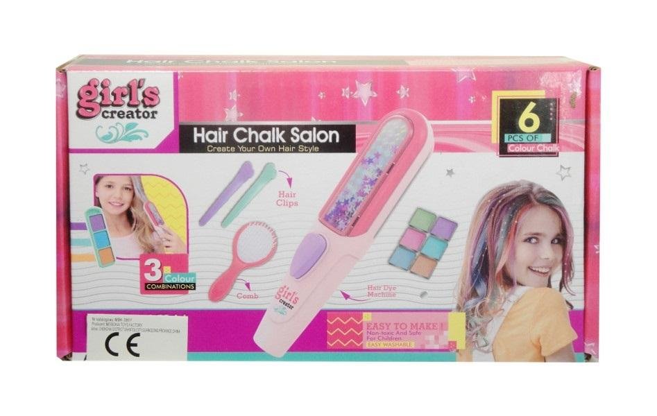 Zestaw piękności dla dziewczynki kredki do włosów. Stwórz unikatową stylizację. W zestawie znajduje się m.in. 6 kolorów kredek, grzebień, klipsy do włosów oraz przyrząd do farbowania włosów. Produkt zapakowany w kartonowe opakowanie. Podane wymiary są wymiarami opakowania. przeczytaj całość