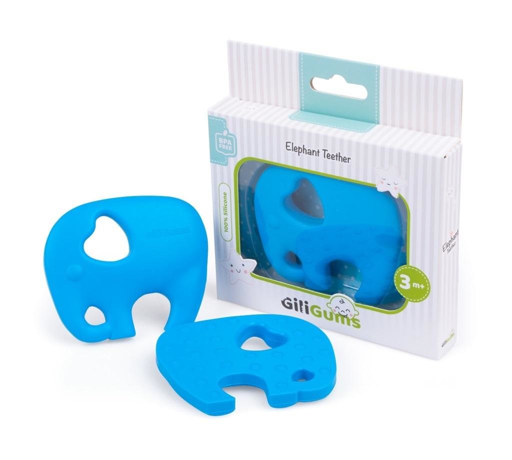 Niebieski słonik wykonany z bezpiecznego silikonu umili maluchom trudny okres ząbkowania. Posiada on specjalne wypustki, które delikatnie masują obolałe dziąsełka. Rozmiar gryzaczka jest dostosowany do małych rączek bobasa, co ułatwia korzystanie z zabawki.