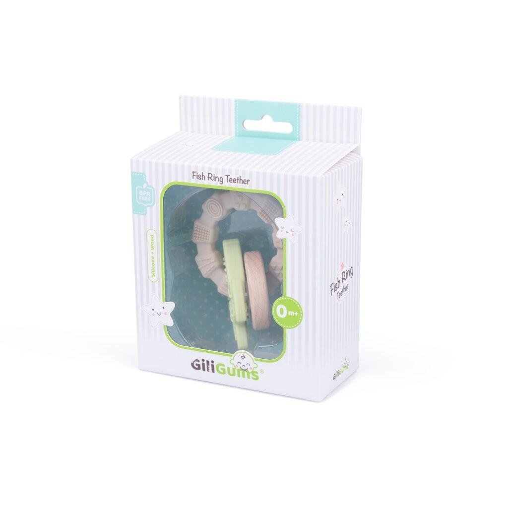 Uroczy gryzaczek wykonany z bezpiecznego silikonu i drewna bukowego to nasz ukłon w stronę natury! Gryzak składa się z pierścienia o nieregularnych krawędziach, do którego przymocowane są dwie zawieszki: drewniane kółeczko i silikonowa rybka. Wypustki o zróżnicowanych kształtach, które zdobią gryzak, przyniosą ulgę maluchowi, delikatnie masując obolałe dziąsła.