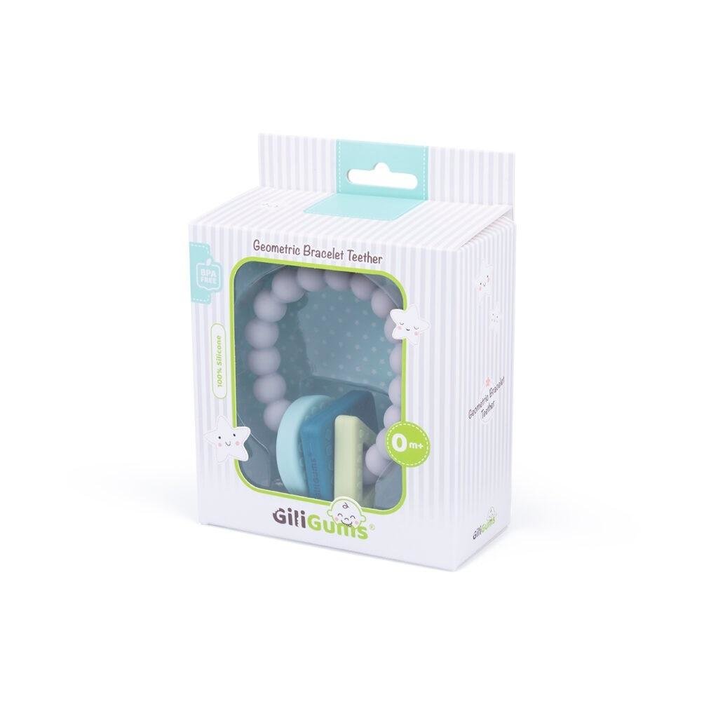 Stylowy, silikonowy gryzaczek bransoletka z trzema zawieszkami w kształcie figur geometrycznych. Każda z zawieszek posiada inny kolor i fakturę. Zdobią je wypustki, które delikatnie masują dziąsła dziecka, przynoszą mu ulgę w ząbkowaniu. Gryzaczek jest miękki i odporny na zgniatanie.Produkt...