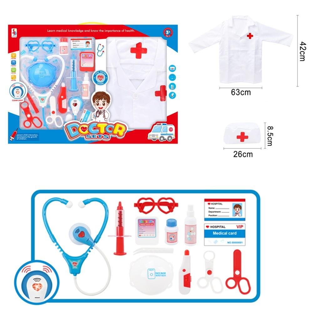 Zestaw zawiera fartuch lekarski, stetoskop, strzykawkę, okulary, nożyczki i inne akcesoria lekarskie. Stetoskop na baterie - 2xAG10 (dołączone). przeczytaj całość